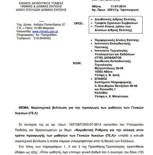 «Σε συνέχεια της με αρ. πρωτ. 103738/Γ2/03-07-2014 εγκυκλίου του Υπουργείου Παιδείας και Θρησκευμάτων με θέμα: «Νομοθετική Ρύθμιση για την αλλαγή στον τρόπο προαγωγής των μαθητών των Γενικών Λυκείων (ΓΕ.Λ)» επήλθε η κάτωθι νομοτεχνική βελτίωση η οποία σήμερα υπερψηφίστηκε από τη Βουλή των Ελλήνων.