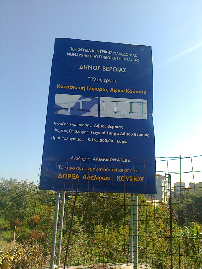 Το έργο της γέφυρας των «Α/φων Κούσιου» μπορεί να έχει ουσιαστικά σταματήσει, ο ανάδοχος να έχει φύγει και η διαδικασία για νέο να βρίσκεται σε εξέλιξη. Η πινακίδα όμως παραμένει εκεί, «αγέρωχη» να μας θυμίζει ένα έργο που ακόμη και όταν ολοκληρωθεί εκφράζονται αμφιβολίες για την χρησιμότητα του. Ας την αλλάξουν τουλάχιστον με βάση τα νέα δεδομένα..