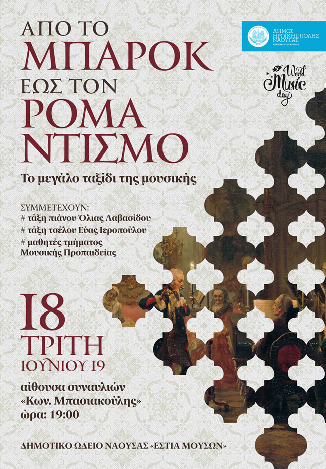 Στο πλαίσιο του εορτασμού της Παγκόσμιας Ημέρας Μουσικής, τα τμήματα πιάνου, τσέλου και μουσικής προπαιδείας του Δημοτικού Ωδείου Νάουσας, με τις καθηγήτριες Όλια Λαβασίδου και Εύα Ιεροπούλου θα παρουσιάσουν την εκδήλωση " Από το Μπαρόκ έως τον Ρομαντισμό - Το μεγάλο ταξίδι της Μουσικής", την Τρίτη 18 Ιουνίου 2019 και ώρα 7μ.μ. στην αίθουσα εκδηλώσεων «Κ. Μπασιακούλη» της Εστίας Μουσών.