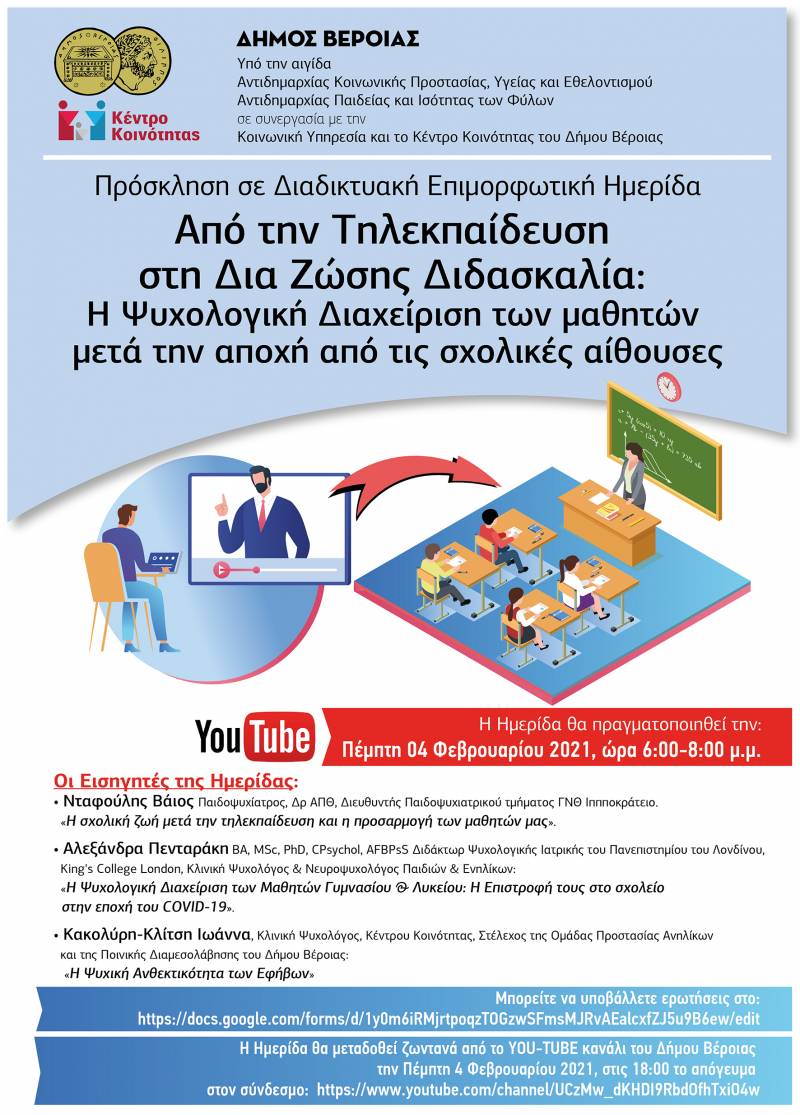 Διαδικτυακή Επιμορφωτική Ημερίδα με θέμα: «Από την Τηλεκπαίδευση στη Δια ζώσης Διδασκαλία: "Η Ψυχολογική Διαχείριση των μαθητών μετά την αποχή από τις σχολικές αίθουσες"
