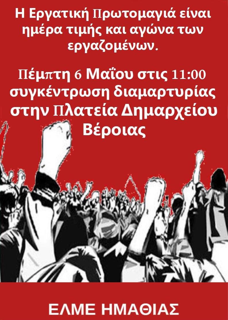 ΕΛΜΕ ΗΜΑΘΙΑΣ: Η Εργατική Πρωτομαγιά είναι ημέρα τιμής και αγώνα των εργαζομένων. Πέμπτη 6 Μαΐου στις 11:00 συγκέντρωση διαμαρτυρίας στην Πλατεία Δημαρχείου Βέροιας