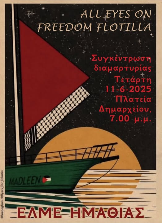 Η ΕΛΜΕ Ημαθίας καταγγέλλει την κατάληψη από τον Ισραηλινό στρατό του ιστιοφόρου "Madleen", που είχε ναυλώσει ο "Στολίσκος Ελευθερί ας" και κατευθυνόταν προς τη Λωρίδα της Γάζας μεταφέροντας ανθρωπιστική βοήθεια, τη σύλληψη και απέλαση των επιβατών του. Πρόκειται για μια ακόμα απαράδεκτη και καταδικαστέα ενέργεια από το κράτος δολοφόνο του Ισραήλ το οποίο, με τις πλάτες των συμμάχων του ΗΠΑ, ΝΑΤΟ και ΕΕ, συνεχίζει τη γενοκτονία του Παλαιστινιακού λαού , στερώντας του ακόμα και τη δυνατότητα πρόσβασης σε ανθρωπιστική βοήθεια . Οι ευθύνες της ελληνικής κυβέρνησης είναι τεράστιες, όσο εξακολουθεί να μην καταδικάζει τη στάση του Ισραήλ και να μην τερματίζει κάθε στρατιωτική συνεργασία με το κράτος τρομοκράτη του Ισραήλ.