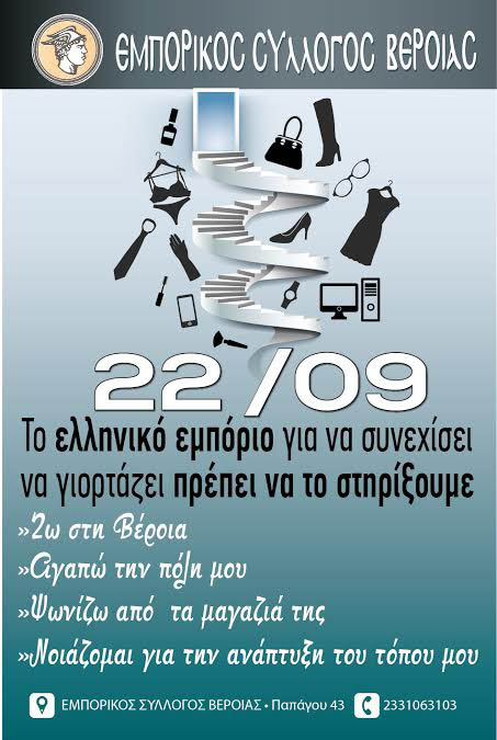 «Η ανακήρυξη της «Ημέρας Ελληνικού Εμπορίου», αποτελεί την μεγαλύτερη και πλέον επίσημη αναγνώριση του εμπορίου, ως σημαντικού αναπτυξιακού πυλώνα, παραγωγής πλούτου, εργασίας και ευημερίας των πολιτών και θεωρούμε ότι πρέπει όλοι να γίνουμε κοινωνοί του μεγάλου γεγονότος», επισημαίνει η Διοίκησης του Εμπορικού Συλλόγου Βέροιας. – Και καλεί τα μέλη του Συλλόγου να συμμετέχουν στην εβδομάδα «Ειδικών Τιμών», από τις 18 έως 23 Σεπτεμβρίου.