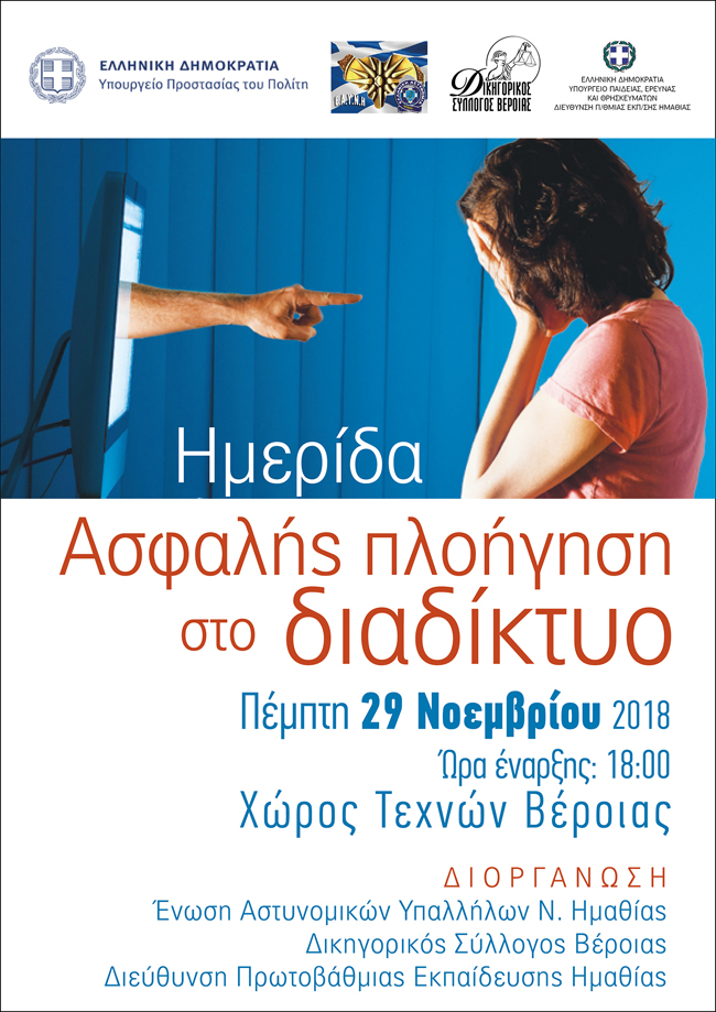 Η Ένωση Αστυνομικών Υπαλλήλων Ν. Ημαθίας, ο Δικηγορικός Σύλλογος Βέροιας και η Διεύθυνση Πρωτοβάθμιας Εκπαίδευσης Ημαθίας, διοργανώνουν Ημερίδα, με θέμα: «Ασφαλής Πλοήγηση στο Διαδίκτυο», την Πέμπτη 29 Νοεμβρίου 2018, στις 18:00΄, στον Χώρο Τεχνών Βέροιας.