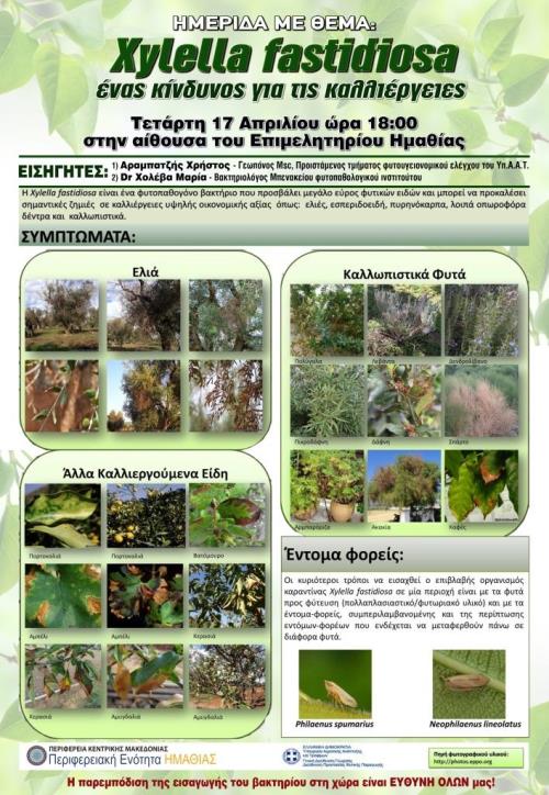 Η Περιφερειακή ενότητα Ημαθίας και η αρμόδια Δ/νση Αγροτικής Οικονομίας και Κτηνιατρικής διοργανώνουν ενημερωτική Ημερίδα με θέμα: ‘xylella fastidiosa ένας κίνδυνος για τις καλλιέργειες’
