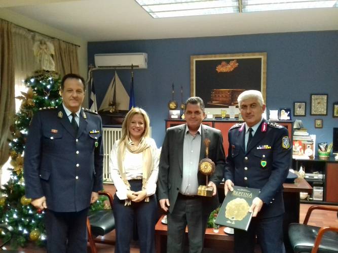 Εθιμοτυπική επίσκεψη στο γραφείο του Αντιπεριφερειάρχη Περιφερειακής ενότητας Ημαθίας Κώστα Καλαϊτζίδη, παρουσία της Περιφερειακής συμβούλου Νίκης Καρατζιούλα, πραγματοποίησε στο πλαίσιο ανάληψης των καθηκόντων του ο νέος Γενικός Περιφερειακός Αστυνομικός Διευθυντής Κεντρικής Μακεδονίας, κ. Πουρσανίδης Μιλτιάδης, ο οποίος συνοδευόταν από τον Αστυνομικό Διευθυντή Ημαθίας κ. Σιμούλη Χρήστο. Συζητήθηκαν θέματα της περιφερειακής μας ενότητας, ενώ ο κ. Καλαϊτζίδης δώρισε στο νέο Διευθυντή, αντίγραφο της σάρισας και της ασπίδας των αρχαίων Μακεδόνων και ένα βιβλίο για τη Βεργίνα, τονίζοντας την ανάγκη να υπερασπιστούμε όλοι μαζί την ελληνικότητα της Μακεδονίας.