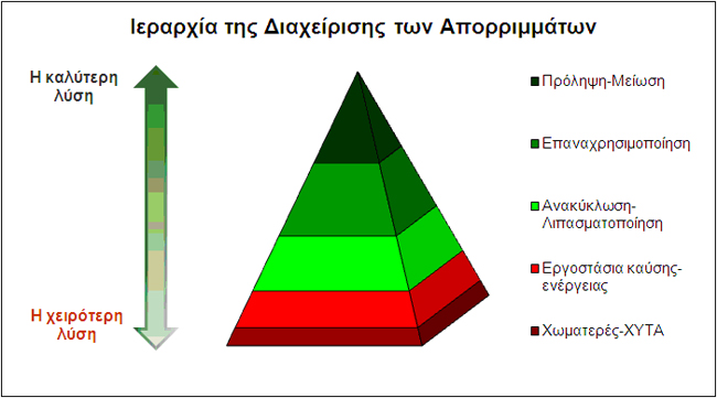 Δηλαδή, ιεραρχώντας από την καλύτερη λύση προς την χειρότερη, δίδεται σαφής προτεραιότητα στην Πρόληψη για Μείωση, στην Επαναχρησιμοποίηση και στην Ανακύκλωση των απορριμμάτων, και μόνο ότι απομένει στα εργοστάσια για Λιπασματοποίηση και Καύση προς παραγωγή ενέργειας, και φυσικά το υπόλειμμα μετά και από την επεξεργασία για θάψιμο σε χώρους υγειονομικής ταφής (ΧΥΤΥ).