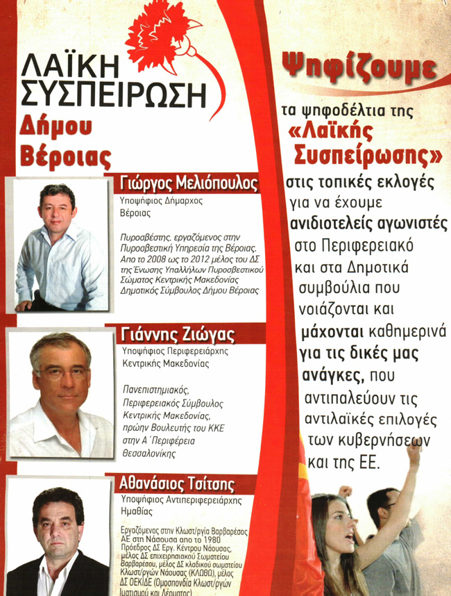 Κυκλοφόρησε το τετρασέλιδο προεκλογικό έντυπο της «Λαϊκής Συσπείρωσης» για τον Δήμο Βέροιας. Σ’αυτό γίνεται αναφορά στα προβλήματα του δήμου και των κατοίκων του, αναλύονται οι αιτίες, γίνεται αναφορά για τη δράση της «ΛΑΣ» μέσα και έξω από το Δημοτικό Συμβούλιο, οι βασικές της θέσεις καθώς και αναπτύσσονται οι λόγοι για να ψηφίσει κανείς τον συνδυασμό. Ταυτόχρονα δίνεται ένα σύντομο βιογραφικό του υποψήφιου δήμαρχου για το δήμο Βέροιας Γιώργου Μελιόπουλου, του υποψήφιου αντιπεριφερειάρχη Ημαθίας Θανάση Τσίτση και του υποψήφιου περιφερειάρχη Γιάννη Ζιώγα.