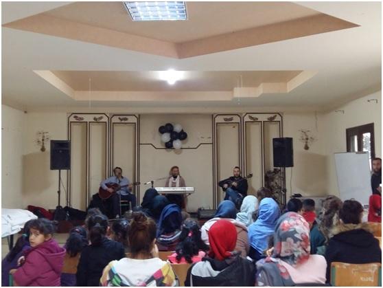 Η κοινωνική λειτουργός του Συλλόγου Ολυμπία Λαζαρίδου, με την βοήθεια μεταφραστή, αναφέρθηκε επιγραμματικά στους σκοπούς του Έρασμου, που ενθαρρύνει και προστατεύει γυναίκες οι οποίες έχουν υποστεί βία, ώστε να σπάσουν την σιωπή τους και να αποδράσουν από το κακοποιητικό περιβάλλον. Επιστρατεύοντας τη διεθνή γλώσσα των ήχων η μουσική τριάδα, Κατερίνα Σωτηρίου αρμόνιο- τραγούδι, Κωστής Χαλάτσης κιθάρα- τραγούδι και Δημήτρης Κύρτσος μπουζούκι, διασκέδασαν μικρούς και μεγάλους. Ιδιαίτερα συγκινητική ήταν η στιγμή που μητέρες μαζί με τα παιδιά τους σηκώθηκαν να χορέψουν προσπαθώντας να μιμηθούν τα βήματα παραδοσιακών ελληνικών χορών. Στη συνέχεια οι φιλοξενούμενου πρόσφυγες είχαν την ευκαιρία να δοκιμάσουν εδέσματα που πρόσφεραν χορηγοί και άλλα που παρασκεύασαν μέλη και φίλες του Έρασμου.