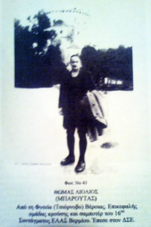 «Μάρτης 1943: Το πρώτο παρών του ΕΛΑΣ στο χωριό. Πρωτοστάτης της οργάνωσης ΕΑΜ ο Θωμάς Λιόλιος (Μπαρούτας).Ακολουθεί τις ένοπλες δυνάμεις του ΕΛΑΣ και μαζί του ο γιός του Κώστας, ο Θυμιόπουλος Θωμάς, ο Τσέος Δημήτρης, ο Λιόλιος Θανάσης και ο Μαργαρίτης Ζιώγας. Λίγο αργότερα βγαίνουν στο βουνό τα αδέρφια Καμινάκη ο Χρήστος και ο Γιάννης. Τον Απρίλη με Μάη εμφανίζεται στο χωριό μπουλούκι της οργάνωσης ΠΑΟ, ως αντάρτες, ρίχνοντας τον σπόρο της διχόνοιας.