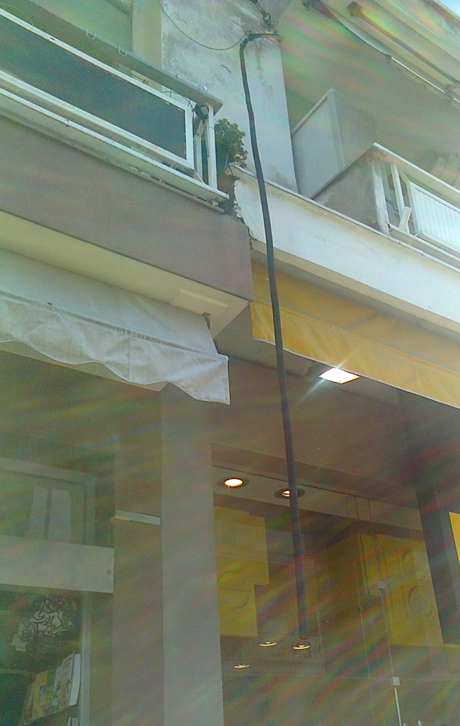 Αυτή τη ΦΩΤΟ μας έστειλε φίλος αναγνώστης. Είναι από την οδό Βενιζέλου στη Βέροια (κοντά στον Άγιο Αντώνιο) όπου μετά τα έργα ανάπλασης και την υπογειοποίηση του δικτύου της ΔΕΗ το εικονιζόμενο καλώδιο (που συνέδεε τη συγκεκριμένη πολυκατοικία με την κολώνα της ΔΕΗ), παρουσιάζει την κατάσταση αυτή. Θα υπάρχει κάποια μέριμνα ;