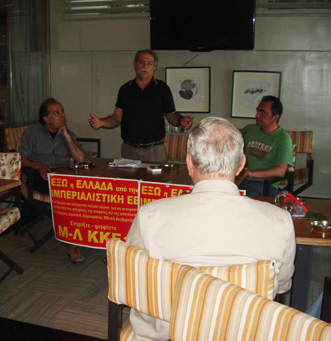 Ενόψει των ευρωεκλογών της 25ης Μάη το Μ-Λ ΚΚΕ πραγματοποίησε πολιτική συγκέντρωση-συζήτηση , την Τρίτη 20 Μάη στο ΚΑΦΕ "ΕΛΙΑ" , με ομιλητές τους Σήφη Σταυρίδη και Θανάση Τσιριγώτη , υποψήφιους ευρωβουλευτές του κόμματος. Αυτοί σημείωσαν: «Αγώνας για την έξοδο της χώρας μας από την ΕΕ σημαίνει πρώτα και κύρια αγώνας ενάντια στην αντιλαϊκή πολιτική της κυβέρνησης Σαμαρά για την ανατροπή των αντεργατικών μέτρων που πέρασαν και αυτών που έρχονται, για την ανατροπή των μνημονίων υποδούλωσης.Ο αδιάκοπος αγώνας ενάντια στην πολιτική της φτώχειας, της ανεργίας, της ιμπεριαλιστικής εξάρτησης και της υποτέλειας που εφαρμόζουν οι κυβερνήσεις της άρχουσας τάξης, είναι ο μόνος δρόμος και η πραγματική διέξοδος για τις λαϊκές μάζες, για την απαλλαγή της χώρας από τα δεσμά της ιμπεριαλιστικής κυριαρχίας, την έξοδο από την ΕΕ και το ΝΑΤΟ, για Δουλειά, Ειρήνη, Δημοκρατία, Εθνική Ανεξαρτησία και Σοσιαλισμό. Προβάλλοντας το Μ-Λ ΚΚΕ το σύνθημα « Έξω η Ελλάδα από την ΕΕ», θέλει να εκφράσει τις αγωνιστικές διαθέσεις πλατιών λαϊκών μαζών που ασφυκτιούν κάτω από την πολιτική της υποτέλειας και ξενοδουλείας των ντόπιων κυβερνήσεων απέναντι στην ΕΕ, να αποκαλύψει ακόμα τις αυταπάτες που καλλιεργούνται για το ρόλο και το χαρακτήρα της ΕΕ, ιδιαίτερα από δυνάμεις που εμφανίζονται με τις ταμπέλες της Αριστεράς. . Και κατέληξαν: «.. Το πραγματικό πρόβλημα μπροστά στις νέες αντιλαϊκές – αντικοινωνικές θύελλες που έρχονται μετά τις εκλογές είναι αν θα χτιστεί βήμα – βήμα ένα ισχυρό λαϊκό, αντιιμπεριαλιστικό κίνημα, ένα παλλαϊκό μέτωπο αντίστασης ικανό να αποκρούσει τα βάρβαρα αντεργατικά μέτρα και να προασπίσει αποτελεσματικά τα άμεσα οικονομικά και κοινωνικά συμφέροντα του εργαζόμενου λαού και να τον ενώσει πάνω στα γενικά και πανεθνικά αιτήματα...»