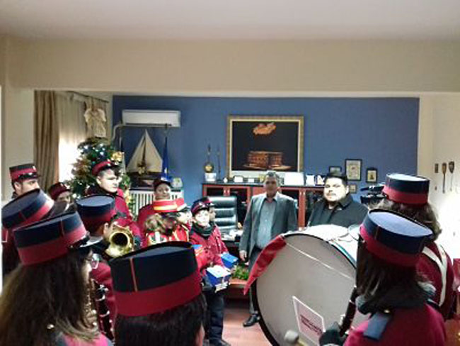 Πρωτοχρονιάτικα κάλαντα στο γραφείο του Αντιπεριφερειάρχη Π.Ε. Ημαθίας Κώστα Καλαϊτζίδη, από στρατιώτες της Β’ μοίρας καταδρομών, τη φιλαρμονική του Δήμου Βέροιας, από μέλη της Ευξείνου λέσχης Ειρηνούπολης, του συλλόγου Βλάχων Βέροιας, του συλλόγου κάμπου Νάουσας και του συλλόγου κοινωνικής παρέμβασης «Έρασμος».