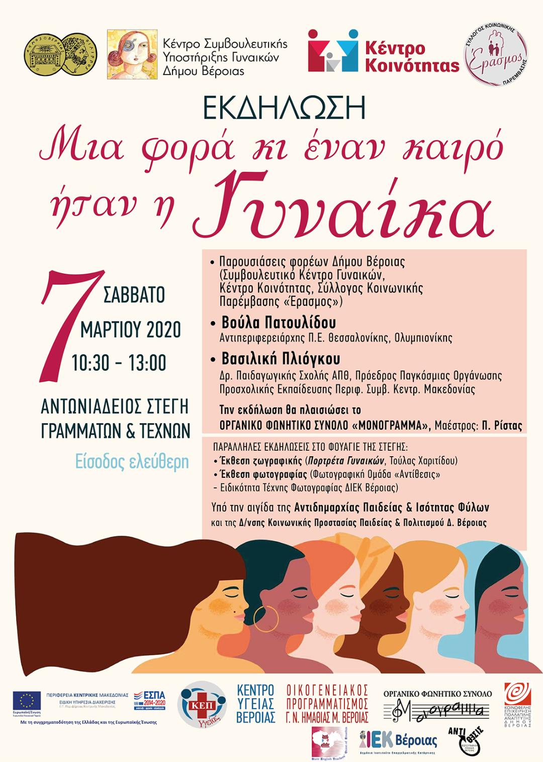 Ο Δήμος Βέροιας σε συνεργασία με το Συμβουλευτικό Κέντρο Γυναικών, το Κέντρο Κοινότητας και τον « Έρασμο» τιμούν τη Γυναίκα με αφορμή την Ημέρα της Γυναίκας στις 8 Μαρτίου και παρουσιάζουν θεματική εβδομάδα με τίτλο: