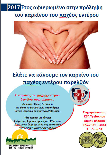 Το ΚΕΠ Υγείας του Δήμου Βέροιας συμμετέχει ενεργά πανελλαδική εκστρατεία των ΚΕΠ Υγείας των Δήμων του Ελληνικού Διαδημοτικού Δικτύου Υγιών Πόλεων για την πρόληψη του Καρκίνου του παχέος εντέρου.