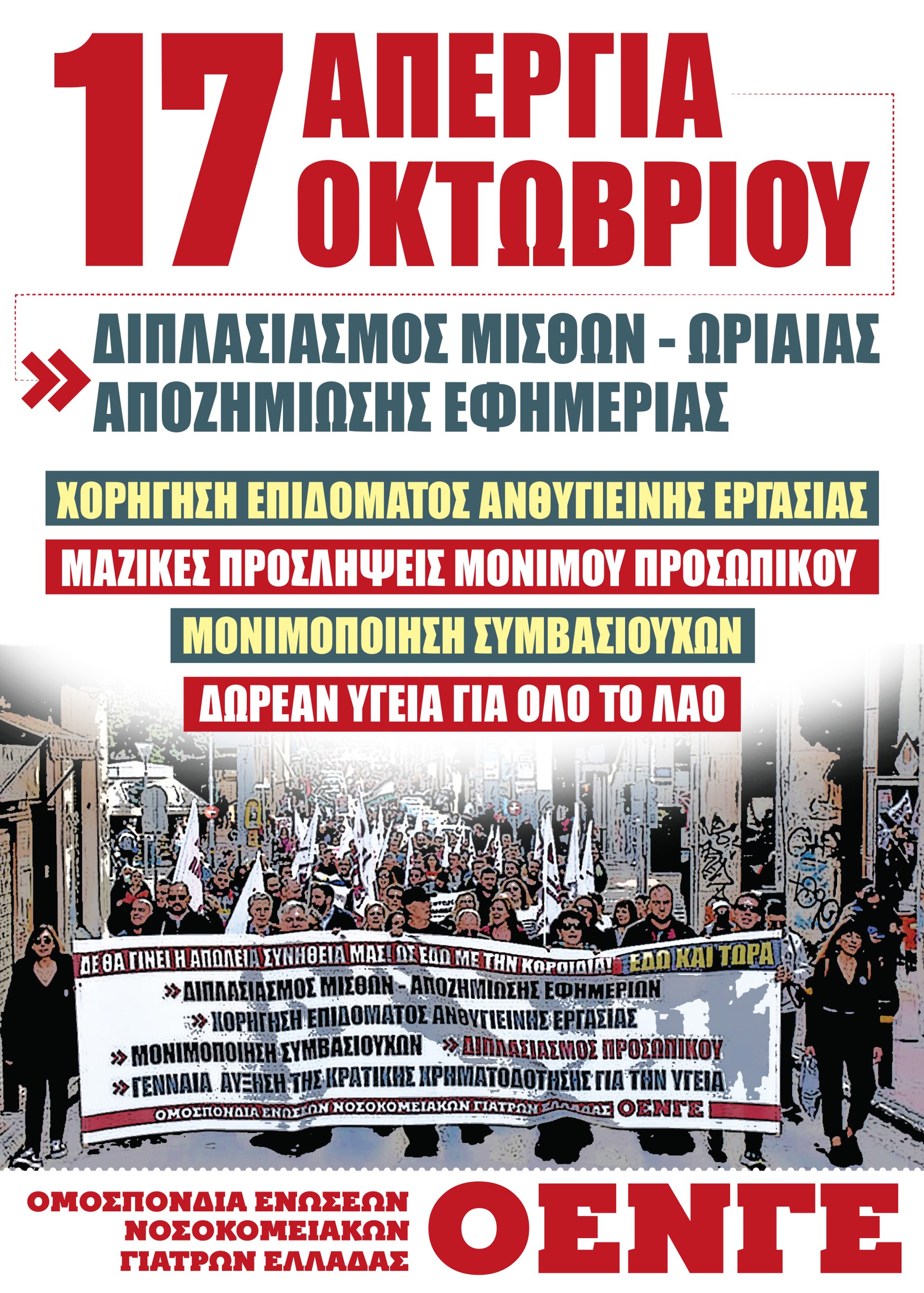 Μαζικές μόνιμες προσλήψεις γιατρών πλήρους και αποκλειστικής απασχόλησης. Ανοικτή προκήρυξη του συνόλου των κενών οργανικών θέσεων μέχρι την κάλυψή τους. Μονιμοποίηση όλων των επικουρικών χωρίς όρους και προϋποθέσεις. Ικανοποίηση των αιτημάτων της ΟΕΝΓΕ για τις άγονες και προβληματικές περιοχές.