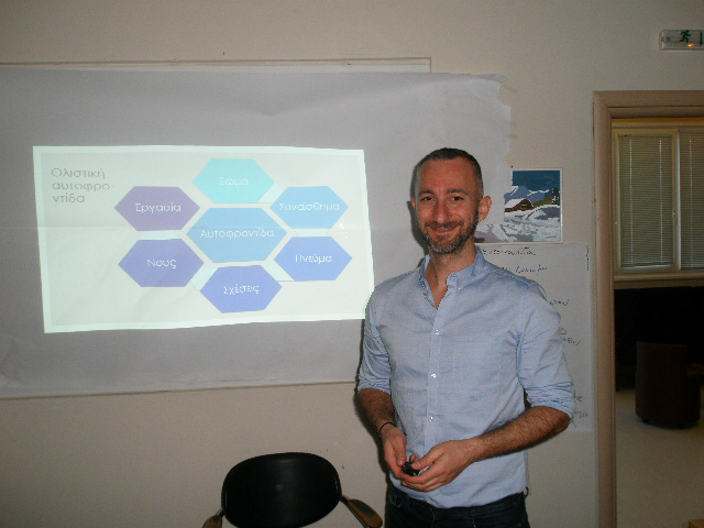 Στο Σεμινάριο της Δευτέρας παρουσίασε τους παράγοντες που συνιστούν την Αυτοφροντίδα, τη σημασία της και μέσα από συμμετοχικές διαδικασίες με τις οικογένειες - φροντιστές παρουσιάστηκαν πρακτικές διαδικασίες και τρόποι ενδυνάμωσής της , για την καλύτερη ποιότητα ζωής τόσο των ίδιων όσο και κατεπέκταση των ληπτών υπηρεσιών ψυχικής υγείας.
